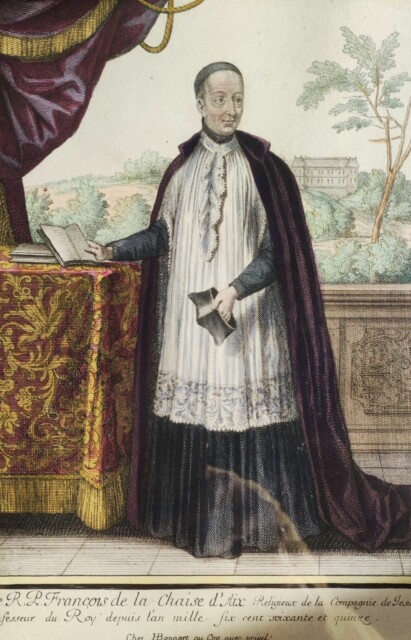 gravure anonyme, Le Père Aix de la Chaise devant le parc et le château du Mont Louis – Collection privée