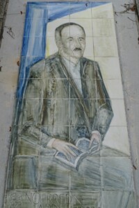 La dalle est recouverte de carrelages peints le représentant avec un livre. Ceux-ci sont signés par Anna Stein, sa femme, et datés de 2020.