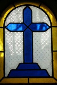 La chapelle est ornée d’un vitrail avec une croix bleu sur fond blanc entouré de jaune, de facture inconnue.