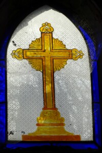 La chapelle est ornée d’un vitrail avec une croix jaune sur fond blanc, de facture inconnue.