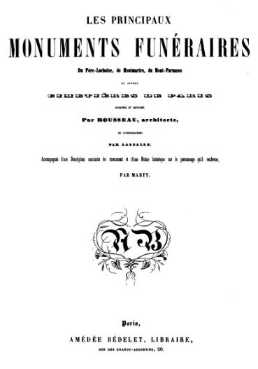 MARTY (Joseph), LASSALLE et ROUSSEAU (illustrations) Les principaux monuments funéraires du Père Lachaise, de Montmartre, du Mont-Parnasse et autres cimetières de Paris, Ed. Amédée Bédelet, Paris, 1839, 86 planches et notices. Un grand nombre de monuments sont représentés, selon les normes du dessin d’architecture : un précieux document, d’autant que certains monuments funéraires ont disparu depuis. Pour le lire en ligne. Présent dans la bibliothèque de l’APPL. Date de création : 2020-12-25.