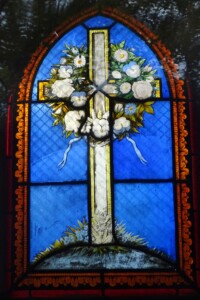 La chapelle est ornée d’un vitrail avec une croix blanche entourée d’une couronne de fleurs sur un fond bleu, de facture inconnue. Elle est signée par l’entrepreneur Admant.