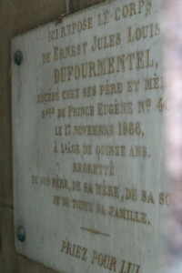 Ici repose le corps, de Ernest Jules Louis, DUFOURMENTEL, décédé chez ses père et mère, Bard du Prince Eugène n°40, le 17 novembre 1866, à l’âge de 15 ans. Regretté, de son père, de sa mère, de sa sœur, et de toute sa famille. Priez pour lui.