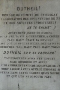 A mon mari, DUTHEIL Pierre, membre du syndicat des inventeurs de France, et de l’association et des artistes industriels, de l’académie nationale manuf.ière de l’hygiène et de l’enfance. Décédé le 19 mai 1891, à l’âge de 51 ans. Regrets sincères de sa veuve et de ses nombreux amis.