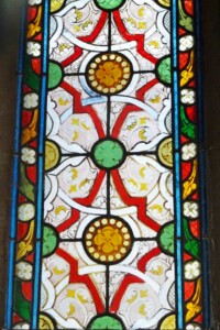 La chapelle, signée par l’entrepreneur Chambroy, est ornée d’un vitrail géométrique avec des fleurs.