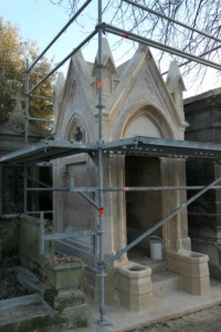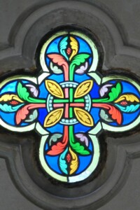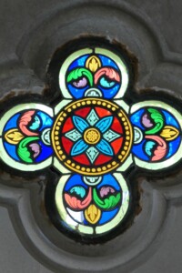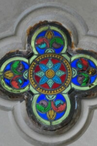 La chapelle s’ouvre par une porte en fer avec des initiales peu lisible (LR ?). Elle est ornée d’un vitrail central quadrilobé et de deux vitraux latéraux, eux aussi quadrilobés, avec un motif floral stylisé, de facture inconnue. Elle a été nettoyée, fin 2025.