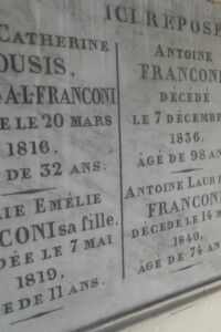 Le jour du convoi, le 8 décembre, d’après ses dernières volontés, un cheval suit immédiatement son corbillard. Il repose avec son fils, Antoine Laurent Franconi (1776-1849), et avec son arrière-petit-fils par alliance, Jean Albert Meurgé (1849-1924).