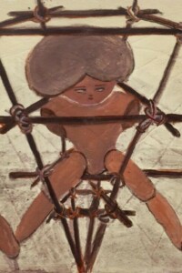 Il y a ces rangées de poupées aux regards médusés, scrutateurs. Ici une tête qui flotte seule, inexpressive, ou bien un corps entier, sans bras et étrangement raide contre le mur. Ces poupées, comme autant d’avatars, sont placées derrière les barreaux d’une cage rafistolée ou même embouteillés, souvent recouvertes d’un fin linceul. Les pièces sont vides et une ampoule pend, mise à nue.