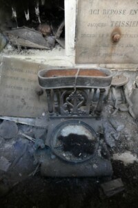 Les cercueil sont posés sur des étagères, au dessus du sol, fermées par une plaque portant le nom de l’occupant. Cette disposition est assez inhabituelle dans le cimetière. Une de ces plaques est brisée et permet de voir un cercueil éventré avec un crane.