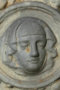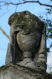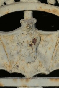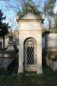 La chapelle s’ouvre par une superbe porte en fonte avec des bas-reliefs figurant, en haut, un petit masque de théâtre grec, une chauve souris aux ailes déployées et, en bas, un bruleur d’encens. Cette porte existe en plusieurs exemplaires identiques dans le cimetière (Monvoisin, Division 30 …).