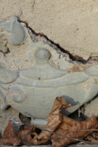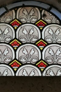 Cette porte est encadrée de deux bas-relief en pierre, des flambeaux renversés. La chapelle s’orne d’un vitrail avec des feuillages stylisés dans un décor géométrique, de facture inconnue.