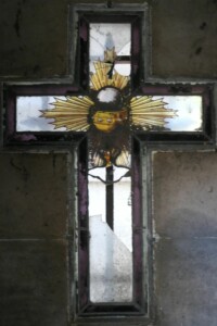 et des inscriptions religieuses, des noms de saint/es : Taborin (deux vitraux).