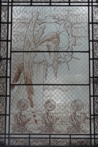 Originale, la chapelle Legris est ornée de deux vitres transparentes gravées avec une femme soufflant dans une trompette et une autre au pied d’une croix. Ce type de gravure se faisait entre les deux guerres, mais il est rare dans le cimetière.