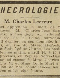 • Cécile (Denise Pauline Lecreux) (1897-1967) qui épousera Louis Auguste Marie Martin (1891-1976), négociant en meubles. Ils vont vivre et décéder à Versailles (Yvelines).