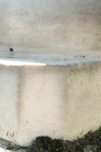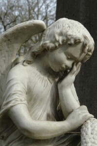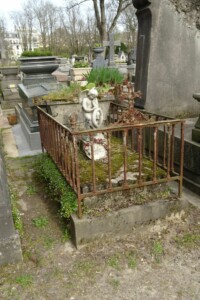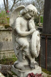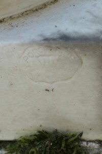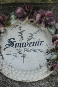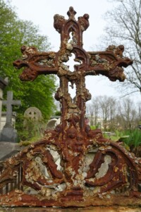La statuette d’angelot, en porcelaine, est signée Porcelaine de France VIX et numérotée 83. Dans la croix, bien oxydée, on peut encore voir une Vierge à l’enfant, en bas-relief.