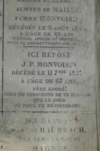Ici repose, Madame Guillemette, Almyre de MAILLY, femme MONVOISIN, décédée le 8 aout 1866, à l’âge de 65 ans. Tendre épouse et bonne mère, nous te regretterons toujours !