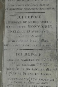 Ici repose, Jeanne Marguerite GENCY, Vve de Richard TESTU, décédée le 30 janvier 1837, à l’âge de 81 ans et 1 mois. Toute sa vie fut employée à faire autant de bien, qui lui a été en son pouvoir. Mr MONVOISIN son gendre l’a, fait déposer près de sa fille et, de sa petite fille pour lui, témoigner sa reconnaissance, et perpétuer sa mémoire. Passants, priez pour eux.