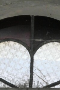 Le toit supporte une grande urne en pierre avec un voile. La chapelle s’orne d’un vitrail semi circulaire, avec des vitres de couleur uniforme, de facture inconnue.
