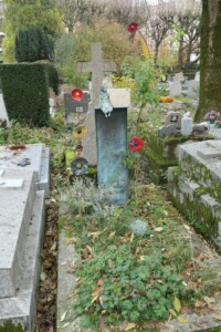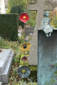 Une petite sculpture en bronze, par Martine Kerbaol, délicate et poignante à la fois, évoque l’enfance disparue prématurément. C’est celle d’une petite fille assise. avec des ailes, figurant un ange. En 2025 vient s’ajouter un arceau de fleurs en céramique, de facture inconnue.