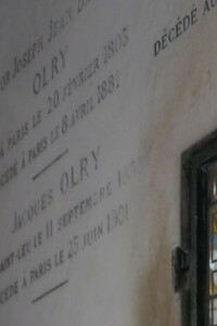 Il repose avec son fils, Jacques Olry (1833-1901), éleveur de chevaux et député de l’Eure, sa bru, Léonie Louise Henriette Roederer (1839-1887), inhumée le 7 novembre 1887, et ses petits-fils, Louis Victor Olry-Roederer (1860-1903), directeur de la maison de champagne Roederer, et Léon Olry-Roederer (1869-1932), directeur de la maison de champagne Roederer, ainsi qu’avec le mari de sa petite fille, le comte Hector de Béarn (1886-1983), capitaine de frégate et grand voyageur.