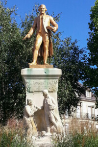 A cette époque, une très grave disette fait rage dans tout le royaume. Il persuade les agronomes de l’intérêt de la pomme de terre comme substitut au blé, l’aliment de base en France. En 1786, pour réussir à convaincre le roi et la cour, et par là même lancer ce tubercule par un phénomène de mode, il fait accommoder diverses préparations de ce légume et le fait goûter. Mais le roi ne fait qu’apprécier la fleur qu’il porte à sa boutonnière.