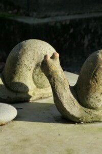 La dalle est ornée de deux gros escargots en terre cuite, non signés, et, sur une plaque, d’un poème de Jacques Prévert, A l’enterrement d’une feuille morte.