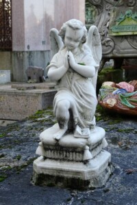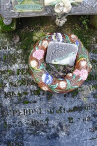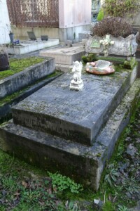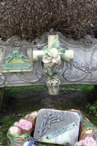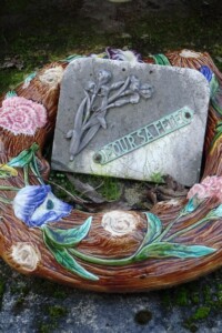 Sur la dalle reposent une couronne de fleurs en céramique, un ange agenouillé en porcelaine et une jardinière en fonte de style Art Nouveau.