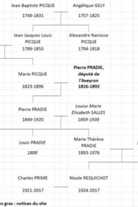 M. Pradié se représente, le 20 février 1876, dans la 2e circonscription de l’arrondissement de Rodez mais il n’obtient que 1,681 voix au premier tour, et se retire de la lutte. Il décède le 8 mars 1892 à Paris. Il repose avec son arrière-petit-fils, le peintre Bernard Requichot (1929-1961) (cf. l’arbre généalogique reconstitué ci dessous).