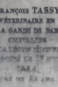 François Tassy voit le jour le 10 décembre 1797 à Neuveville (Meurthe et Moselle). Il est docteur vétérinaire en 1er à la Garde de Paris. Il décède le 17 juin 1864 et repose avec son épouse, Angélique Sophie Brion, décédée en 1873.