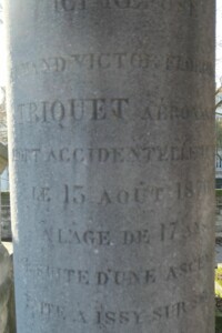 Ici repose, Armand Victor Florimond, TRIQUET, aéronaute, mort accidentellement, le 13 aout 1876, à l’âge de 17 ans, par suite d’une ascension, faite à Issy-sur-Seine. Regretté, de ses père et mère, de ses sœurs, de toute sa famille, et de ses amis.